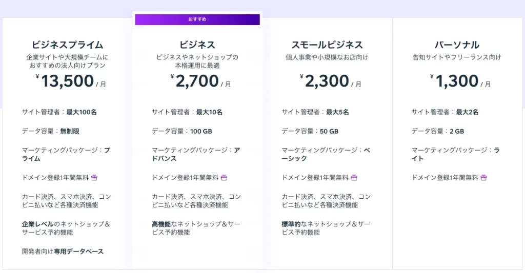 WIXですと、「ビジネス」か「スモールビジネス」が選択肢になります。コーポレートサイトであれば「スモールビジネス」で十分なケースが多いですが、月額2,300円になります。
