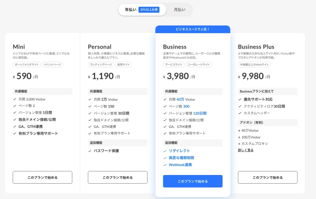 Studioの場合ですと、「Personal」か「Business」が現実的な選択肢になります。WIXに比べるとまだ料金は抑えめですが、記事数が増えていくと管理が複雑になったり、機能の不十分さなどでご相談をいただくケースがあります。