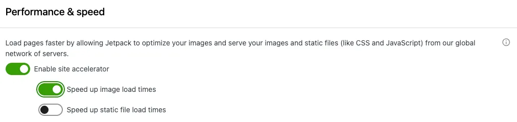 [Jetpack→設定→Performance]から設定できるようになっております。プラグインのバージョンや操作タイミングによって設定画面は下記のように異なります。