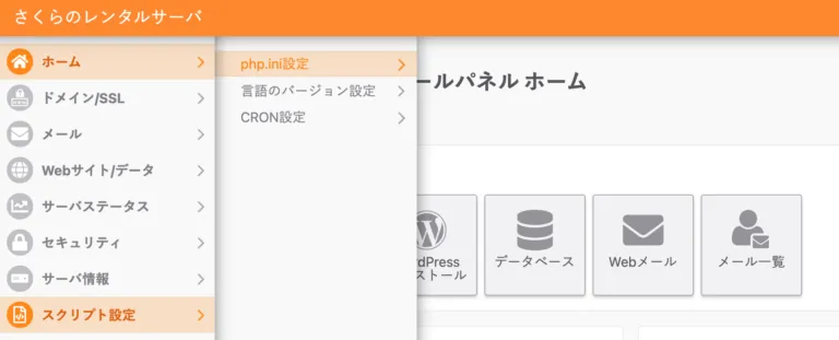 左側のサイドバーメニューから「スクリプト設定」 > 「php.ini設定」 をクリックします。 (※コントロールパネルのUIによっては、「アプリケーションの設定」 > 「PHP設定の編集」 と表示されている場合もありますので、お使いの画面に合わせて選択してください)
